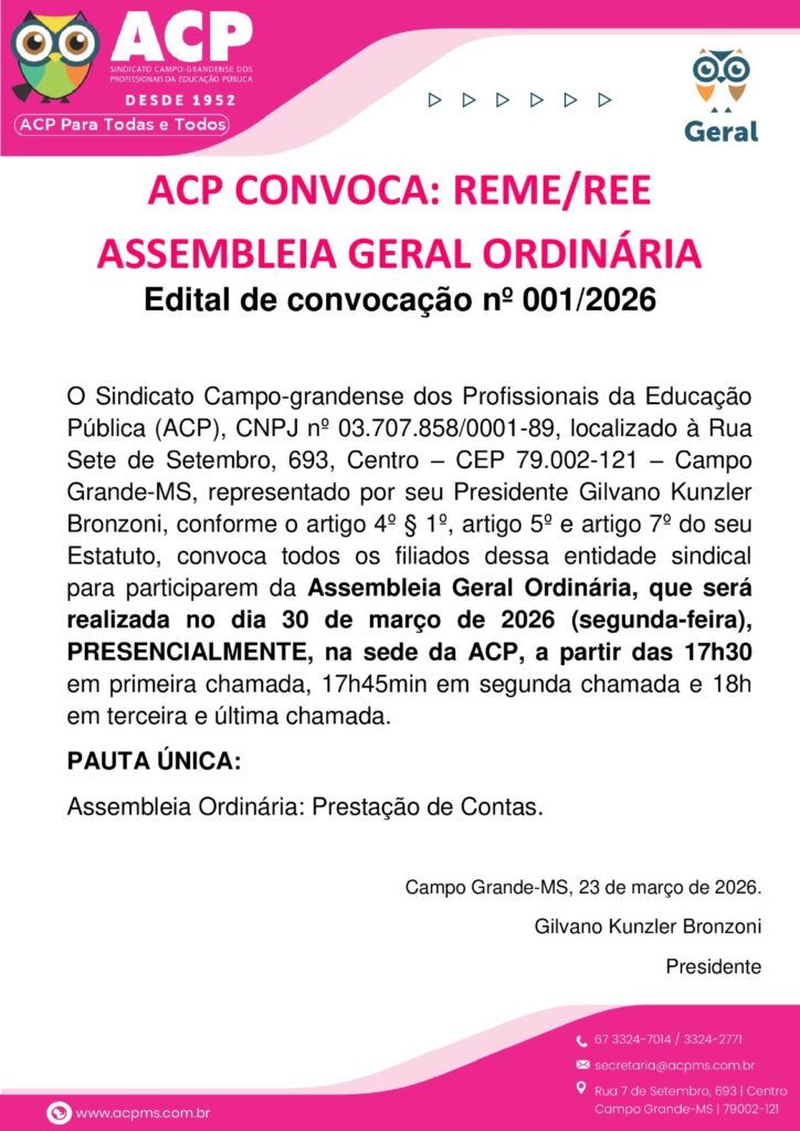 O Sindicato Campo-Grandense dos Profissionais da Educação Pública (ACP) convoca todos os filiados das redes municipal (REME) e estadual (REE) para participarem da Assembleia Geral Ordinária, que será realizada no dia 30 de março de 2026, na sede da entidade, em Campo Grande.