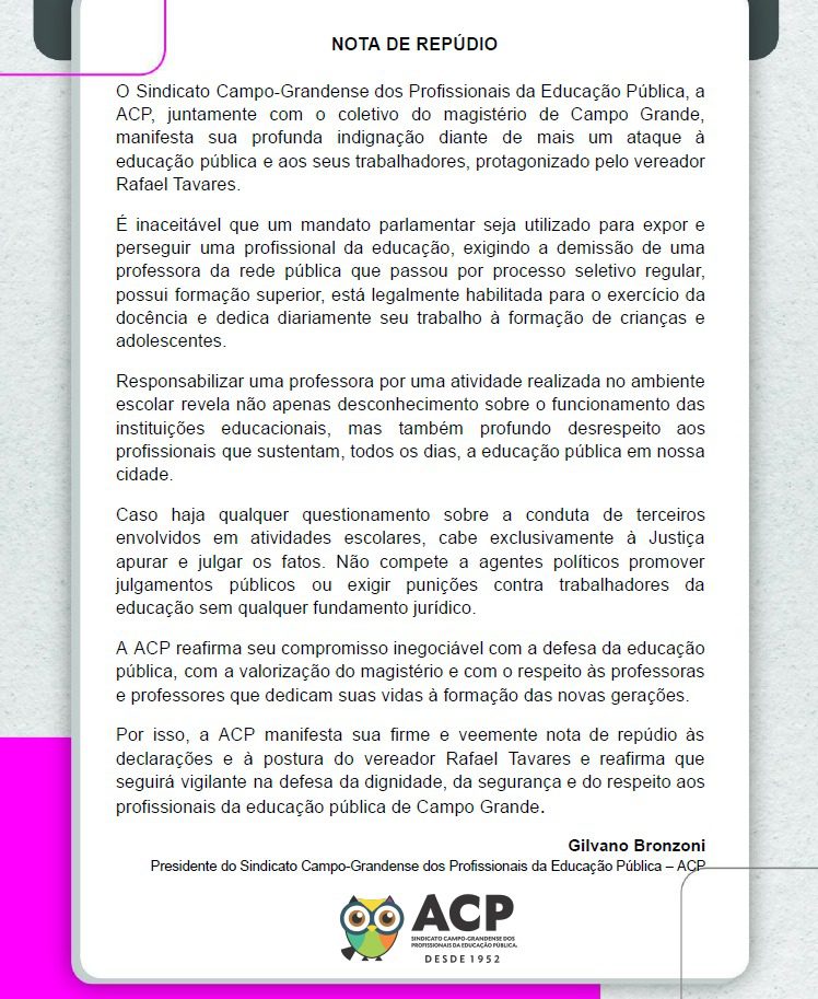 O Sindicato Campo-Grandense dos Profissionais da Educação Pública (ACP) manifestou publicamente sua indignação diante de mais um ataque à educação pública e aos seus trabalhadores, protagonizado pelo vereador Rafael Tavares. A manifestação ocorre após o parlamentar exigir a demissão de uma professora da rede pública municipal em razão de uma atividade realizada no ambiente escolar.