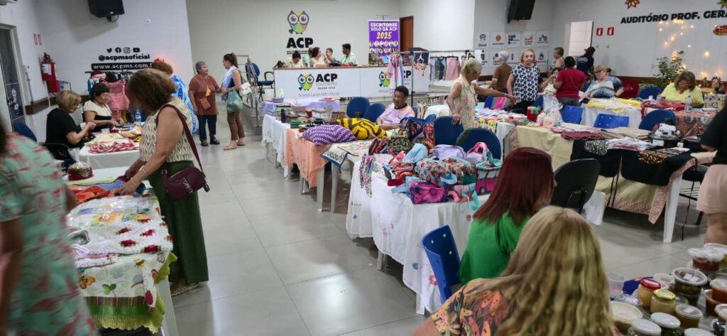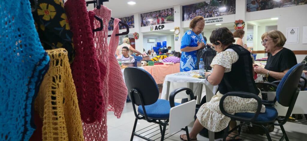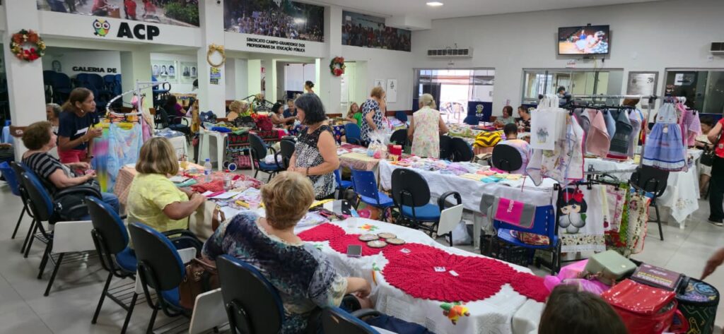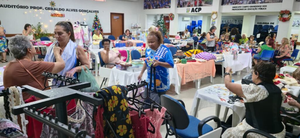 A sede da ACP recebeu na primeira semana de dezembro o tradicional bazar das aposentadas, um espaço que reuniu artesanato, doces caseiros, livros e muitas histórias que refletiram a trajetória de vida das profissionais da educação pública de Campo Grande. O evento expôs produtos desenvolvidos ao longo do ano nas oficinas oferecidas pelo Sindicato Campo Grandense dos Profissionais da Educação Pública.